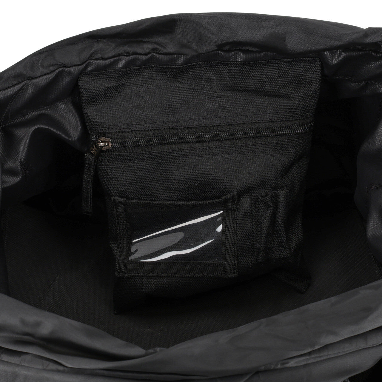 - Inside, there is a zipper pocket with a transparent slot for a card and two loops for pens