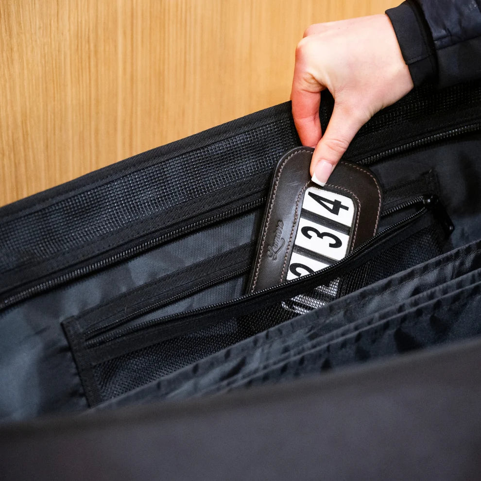 This is not your average saddle pad bag. Style meets functionality in this smart solution to saddle pad storage. Our sleek design offers effortless organisation without compromising on utility - keeping you neat and tidy from stable storage to competition travel. Intentionally designed to store up to 5 english saddle pads in the main compartment. The external front pocket offers space to store accessories such as half pads and ear bonnets, whilst the internal mesh pocket is dedicated to keeping smaller items safe and secure. Saddle Pad Bag: approx. 75cm x 9cm x 61cm Front Pocket: approx. 75cm x 39cm Internal Mesh Pocket: approx. 31cm x 19cm