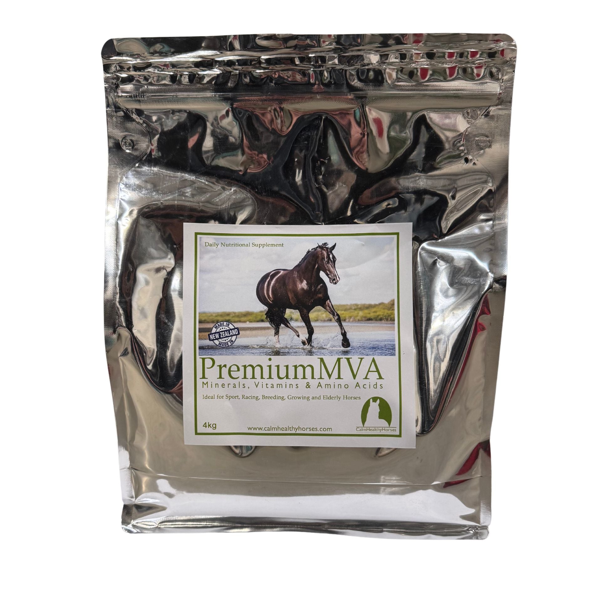Premium MVA not only supplies all the necessary vitamins and minerals found in Premium NZ Horse Minerals, but also all the amino acids plus Pre & Pro Biotics for sustaining overall health, immune function, top-line and hoof health.